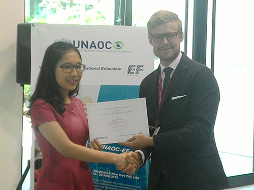 Đây là năm thứ ba liên tiếp trường học UNAOC-EF được tổ chức, tập hợp 75 nhà lãnh đạo trẻ trên thế giới cùng thảo luận các thử thách toàn cầu trong bối cảnh đa dạng về văn hoá và tôn giáo, cũng như kỹ năng xây dựng hòa bình của công dân toàn cầu. Đại diện của Việt Nam tham dự trường học mùa hè UNAOC-EF năm nay là Phan Trâm Anh- 21 tuổi, sinh viên năm 3, trường Đại học Kinh tế quốc dân Hà Nội. Trâm Anh đã xuất sắc vượt qua hơn 3.200 bạn trẻ Việt Nam khác và được Liên hợp quốc lựa chọn là đại diện của Việt Nam tham dự trường học mùa hè UNAOC-EF năm 2015.