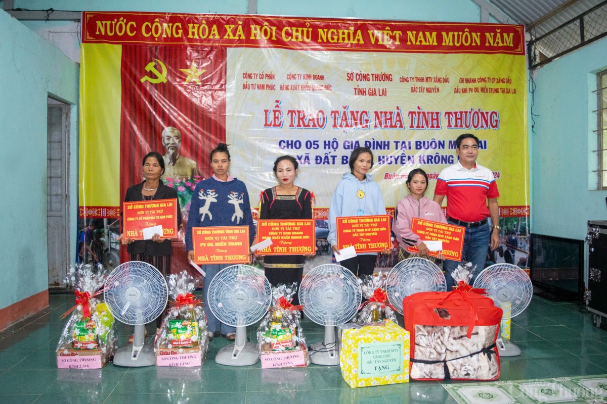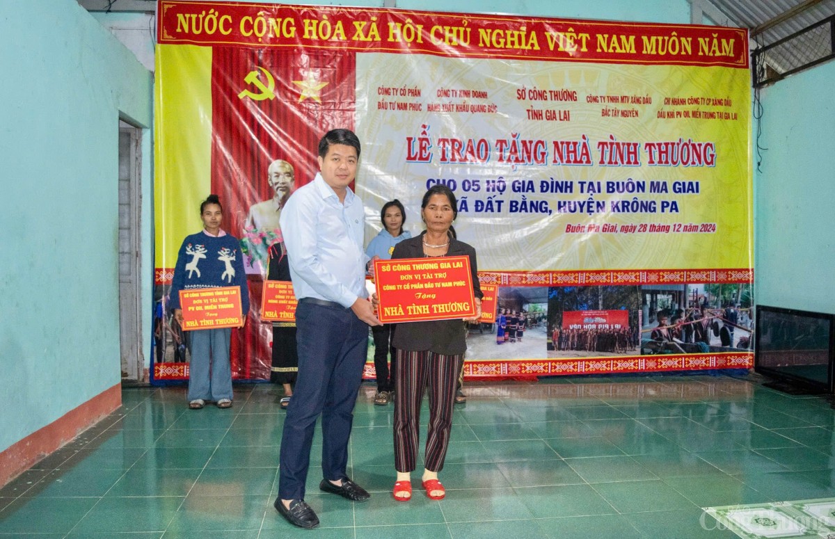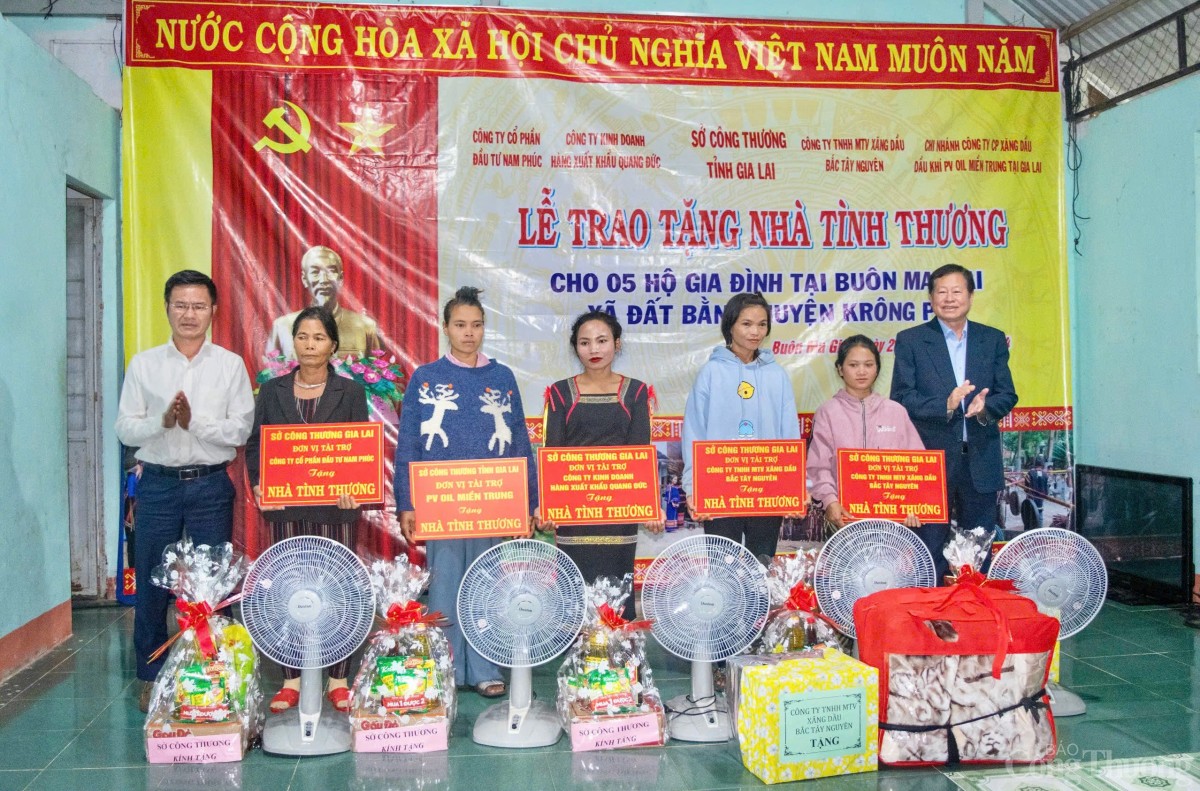 | Đại diện Sở Công Thương tỉnh Gia Lai trao tặng 5 căn nhà cho 5 hộ dân với tổng kinh phí 330 triệu đồng. |