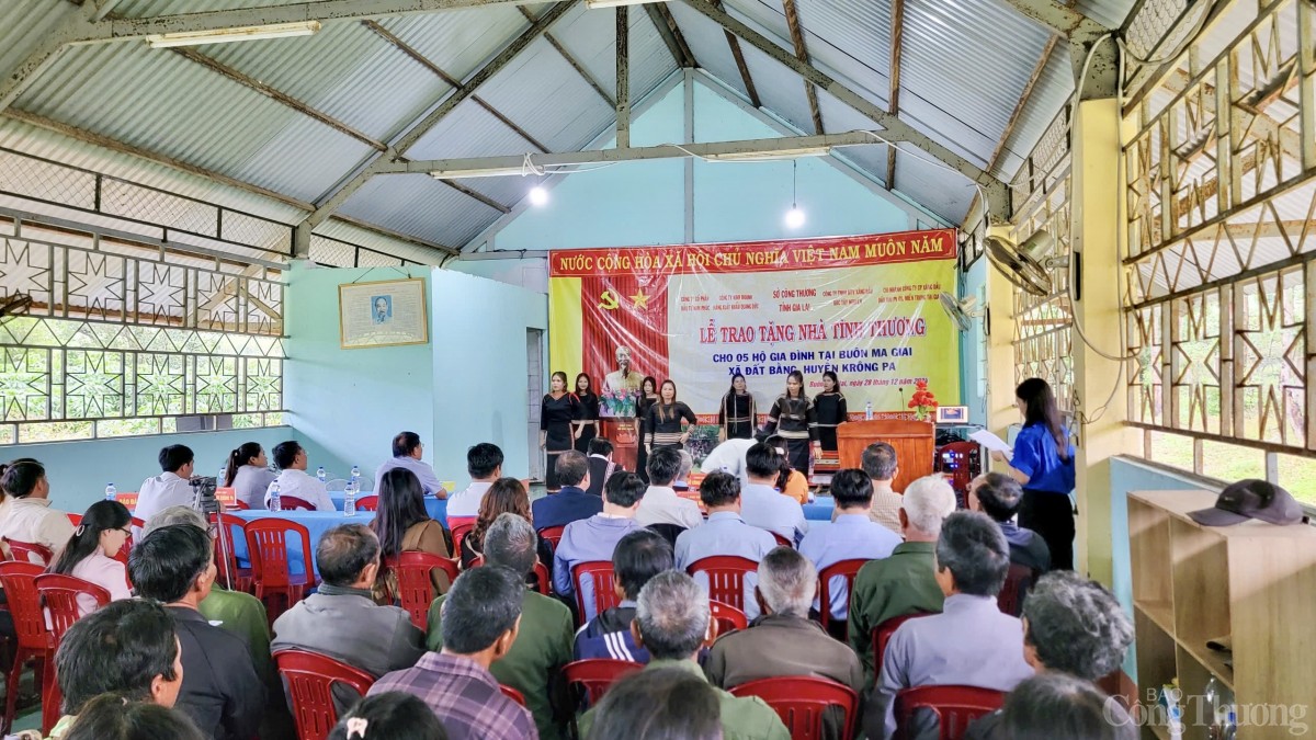 | Quang cảnh buổi lễ trao tặng nhà tình thương cho 5 hộ dân Buôn Ma Giai (xã Đất Bằng, huyện Krông Pa). |