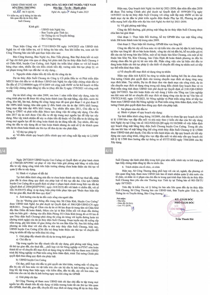 Ngày 20/9/2023, Sở Công Thương Nghệ An đã có công văn gửi UBND tỉnh Nghệ An, Ban Tuyên giáo Tỉnh uỷ Nghệ An, Sở Thông tin và Truyền thông Nghệ An và Báo Công Thương trong đó có đề cập đến việc dự án Thủy điện Suối Choang (Ở xã Châu Khê, huyện Con Cuông) triển khai chậm so với kế hoạch hàng chục năm, nhiều lần xin điều chỉnh tiến độ, vướng mắc thủ tục pháp lý, có sai phạm trong lĩnh vực đất đai và xây dựng.