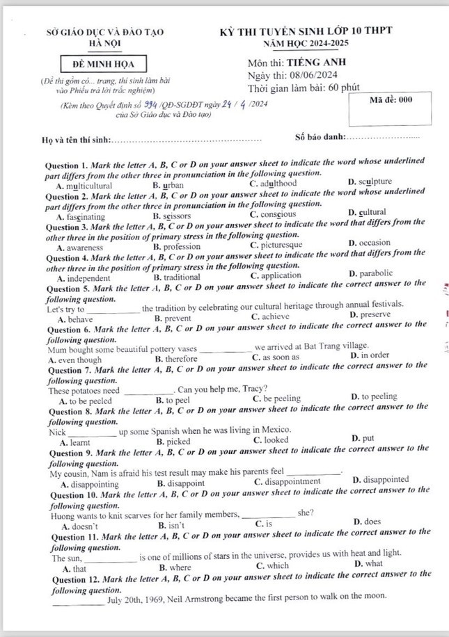 Nhằm giúp cho học sinh ôn tập tốt nhất cho kỳ thi, Sở Giáo dục và Đào tạo Hà Nội đã công bố cấu trúc định dạng đề thi và đề minh họa 3 môn Toán, Ngữ văn, Ngoại ngữ.