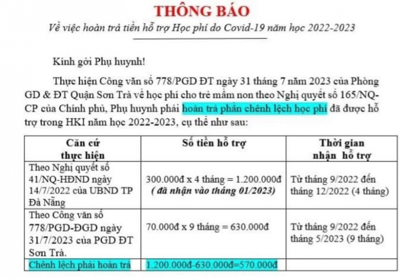 Ví dụ, tại quận Liên Chiểu, quận đã hỗ trợ 4 tháng cho trẻ ngoài cơ sở công lập là 1.200.000 đồng (300.000 đồng/tháng) theo Nghị quyết 46. Nhưng theo quy định mới, học phí được hỗ trợ trong 9 tháng nhưng mức hỗ trợ tính theo Nghị quyết 35, là 70.000 đồng/tháng, hỗ trợ 9 tháng là 630.000 đồng. Phụ huynh sẽ phải hoàn trả tiền chênh lệch là 570.000 đồng.