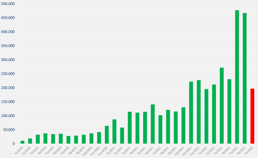 Tính chung cả 7 tháng đầu năm 2022, cá nhân trong nước mở mới ròng hơn 2,04 triệu tài khoản chứng khoán, gấp 2,8 lần cùng kỳ năm trước và cao hơn 33,4% so với mức 1,5 triệu tài khoản mở mới cả năm 2021.