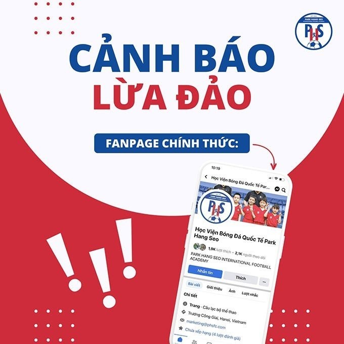 Mới đây trong một thông báo mới nhất trên fanpage chính thức của Học viện Bóng đá Quốc tế Park Hang Seo đã đưa ra thông báo cảnh giác dành cho các phụ huynh. Trong thông báo có đoạn: “Hiện đang xuất hiện nhiều fanpage mạo danh Học viện Bóng đá Quốc tế Park Hang Seo. Các trang này ngoài việc ăn cắp thông tin của học viên/phụ huynh còn lừa đảo để chiếm đoạt tài sản.