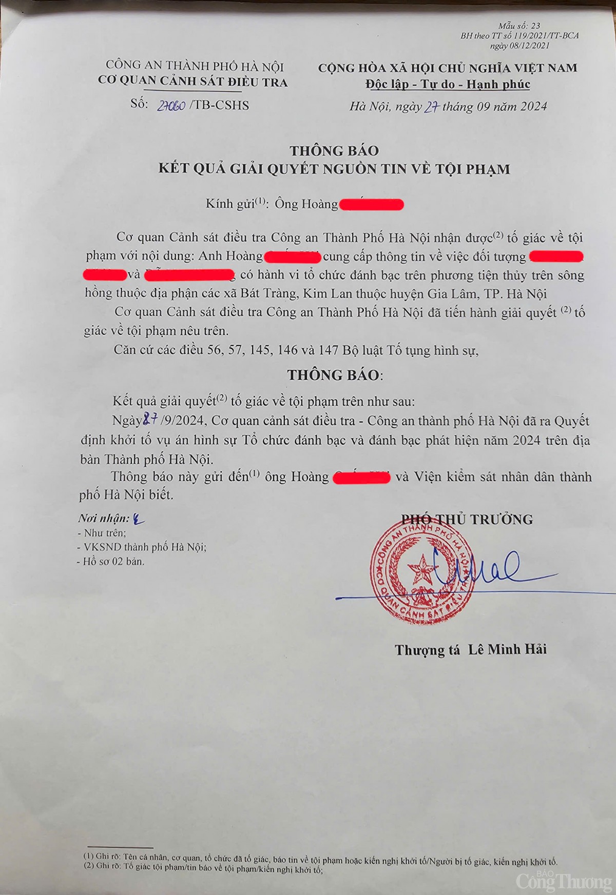 Văn bản số 27060/TB-CSHS ngày 27/9 của Cơ quan CSĐT Công an TP. Hà Nội nêu rõ: “Cơ quan CSĐT Công an TP. Hà Nội nhận được tố giác về tội phạm với nội dung: Anh H.Q.H cung cấp thông tin về đối tượng Đ.V.N và Đ.V.T có hành vi tổ chức đánh bạc trên phương tiện thuỷ trên sông Hồng thuộc địa bàn xã Bát Tràng, Kim Lan thuộc huyện Gia Lâm, TP. Hà Nội.