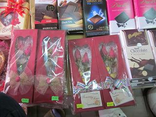 Mặt hàng “chủ lực” thứ hai là socola. Thị trường sản phẩm này năm nay không có quá nhiều mới mẻ. Chủ yếu vẫn là các thanh hoặc hộp socola với đủ hình dáng, nguồn gốc và giá cả. Giá một hộp socola sản xuất trong nước chỉ khoảng 45.000- 75.000 đồng/hộp (cỡ vừa). Trong khi đó, đối với hàng ngoại nhập, được giới thiệu là sản xuất tại Bỉ, Pháp, Đức, rẻ nhất cũng là 120.000 đồng/thanh. Điểm nhấn của mặt hàng này năm nay là sự xuất hiện của sản phẩm hộp hoa hồng khô có nụ làm bằng socola. Loại này đang rất được người tiêu dùng yêu thích nhờ hình thức đẹp, ý nghĩa và giá cả phải chăng (75.000 đồng/hộp nhỏ).