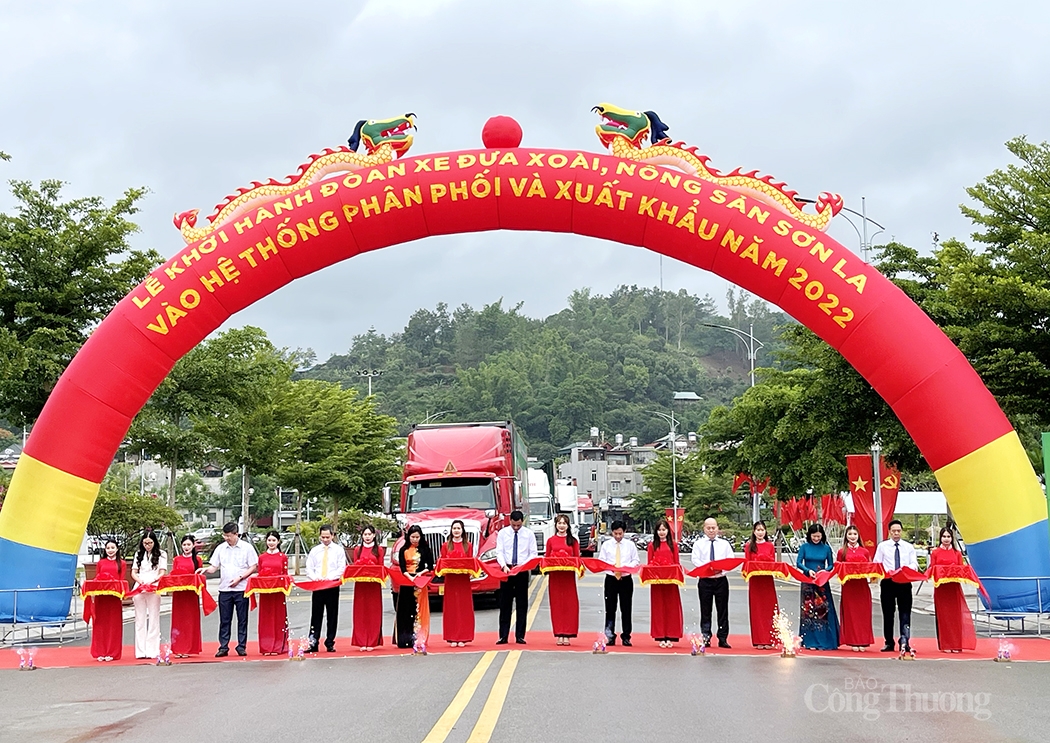 | Nghi thức cắt băng khởi hành đoàn xe đưa xoài, nông sản Sơn La vào hệ thống phân phối và xuất khẩu |