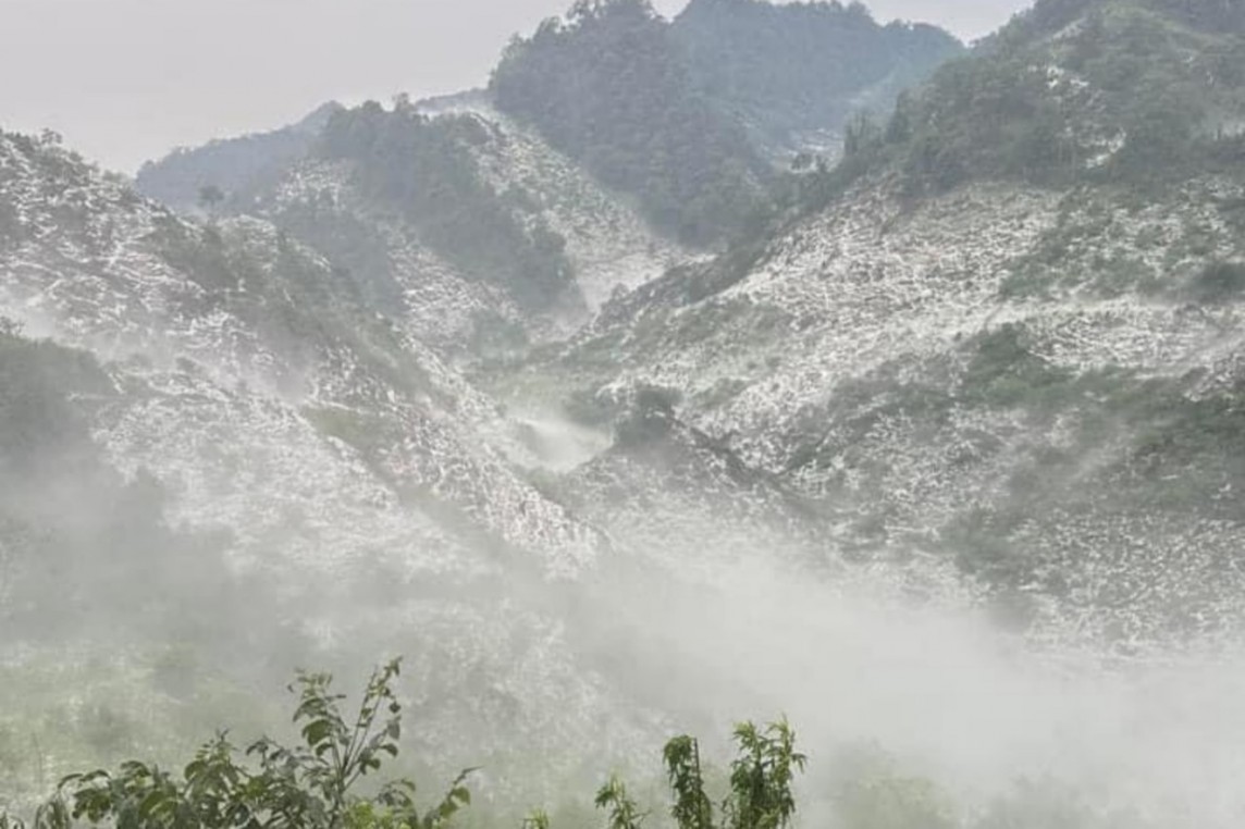| Mưa đá phủ trắng cả những ngọn núi. (Ảnh: Phạm Hoài) |