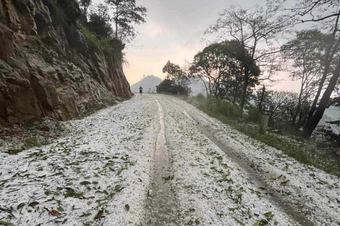 | Cơn mưa đá phủ trắng xoá cả đường đi. (Ảnh: Phạm Hoài) |