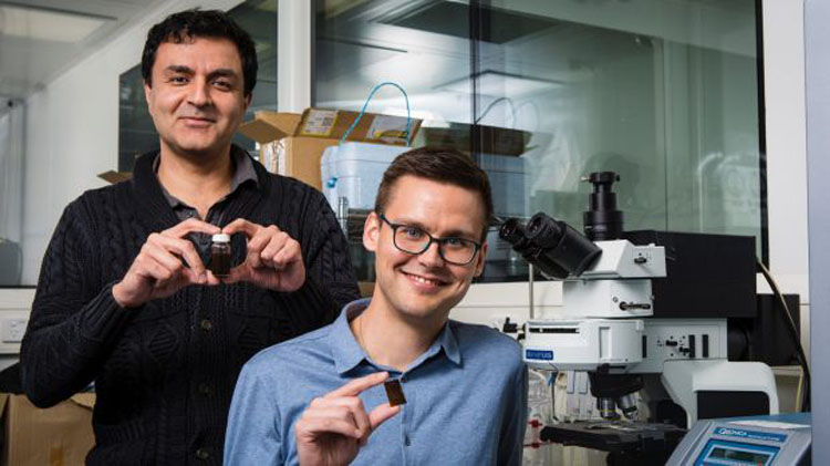 Giáo sư Kourosh Kalantar-zadeh (bên trái ảnh) và tiến sĩ Torben Daeneke với lọ sơn bằng năng lượng mặt trời và mảnh thủy tinh được ứng dụng loại sơn này