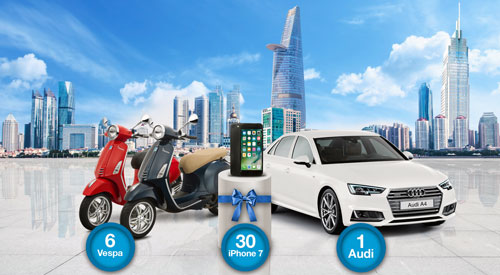 Đó là Chương trình quay số trúng thưởng với những giải thưởng vô cùng hấp dẫn bao gồm một xe ô tô Audi, 6 xe máy Vespa thời thượng và 30 điện thoại iPhone 7. Chương trình quay số trúng thưởng sẽ được tổ chức hàng tháng trong thời gian từ nay đến 7/10/2017, và áp dụng cho tất cả 3 dòng thẻ tín dụng của Standard Chartered tại Việt Nam, bao gồm: Priority WorldMiles, WorldMiles và Platinum Cashback.
