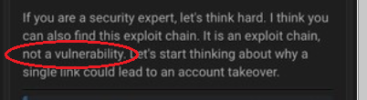 Ngoài ra, tin tặc này có vẻ là người mới vì tài khoản đăng thông tin này là mới được tạo. Đồng thời trong bài viết có tiết lộ những thông tin không cần thiết như "Tôi biết nhiều kỹ sư bảo mật của VNG chơi CTF,..." Điều này có thể cho thấy người rao bán này tuổi còn trẻ và không có kinh nghiệm. Ở gần cuối bài đăng, người bán này nói rằng chuỗi khai thác đó không phải là lỗ hổng, ngược lại hoàn toàn nội dung ở đầu bài viết là điều còn khó hiểu hơn.