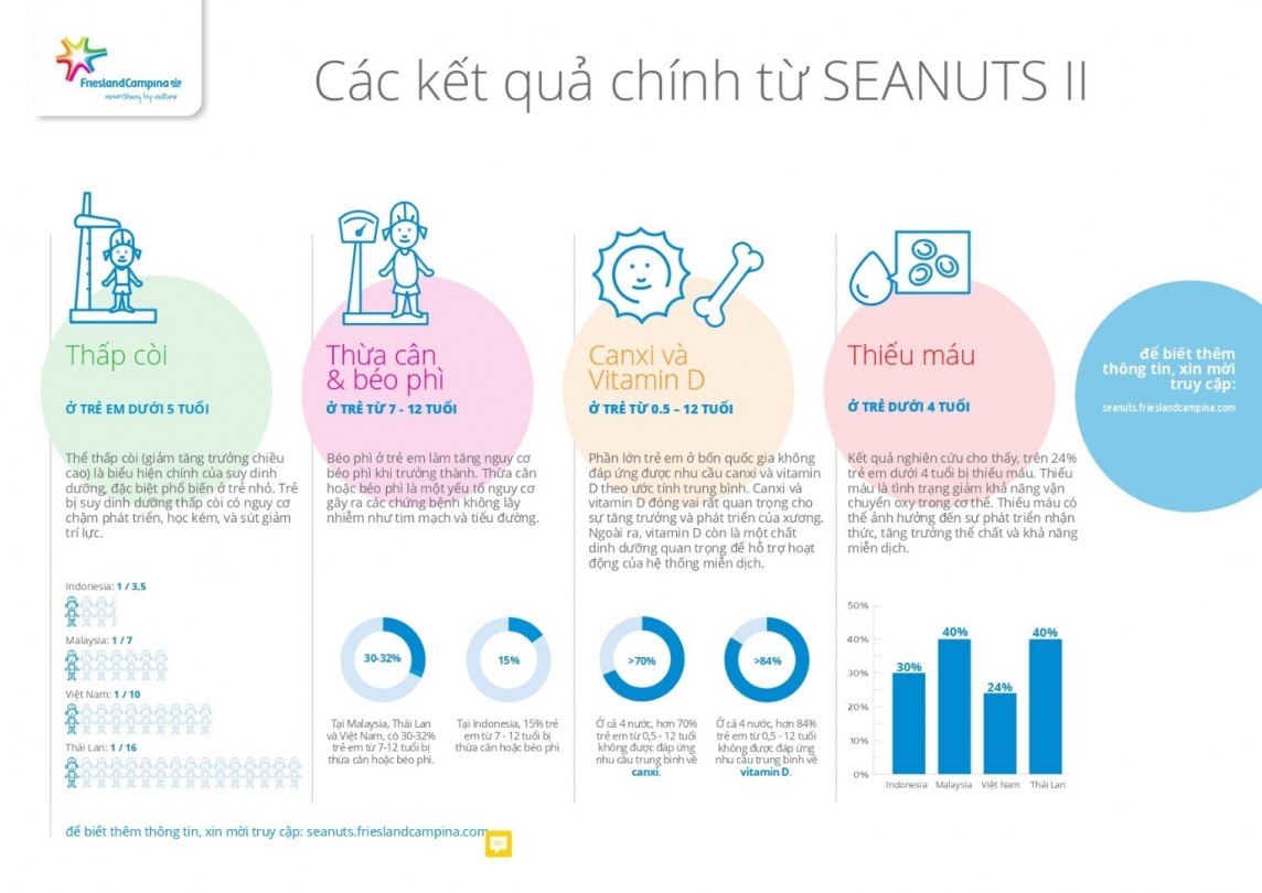 Trong giai đoạn 2019 – 2024, Tập đoàn Royal FrieslandCampina đã cùng các trường đại học và viện nghiên cứu hàng đầu ở Indonesia, Malaysia, Thái Lan và Việt Nam tiến hành khảo sát dinh dưỡng khu vực Đông Nam Á SEANUTS II trên gần 14.000 trẻ em từ sáu tháng đến 12 tuổi. Từ dữ liệu thu thập được, chương trình giúp các chuyên gia dinh dưỡng thấy được bức tranh toàn cảnh về thực trạng dinh dưỡng ở trẻ nhỏ, tạo tiền đề giải quyết 3 gánh nặng lớn gồm suy dinh dưỡng thấp còi, thừa cân béo phì và thiếu vi chất dinh dưỡng, cũng như hiểu rõ tầm quan trọng của việc thực hiện các giải pháp dinh dưỡng. Trong đó, sữa là nguồn dinh dưỡng tối ưu, an toàn và phù hợp với điều kiện kinh tế mỗi gia đình, giải quyết thách thức cho sự phát triển thể trạng và sức khỏe của trẻ.