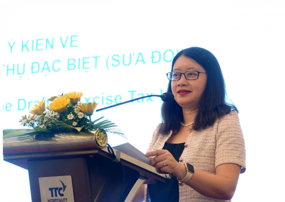 | Bà Lê Thùy Linh – Phó trưởng phòng Thuế Tiêu thụ đặc biệt, Cục Cục Quản lý, Giám sát chính sách thuế, phí và lệ phí Bộ Tài chính chia sẻ về dự thảo Luật. Ảnh: BTC |