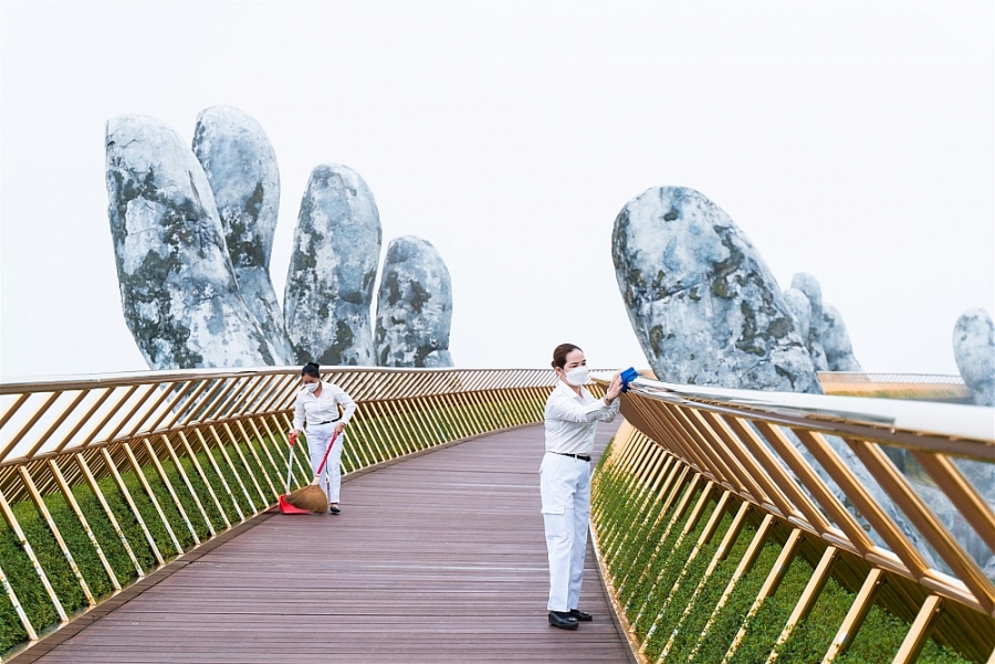 Sau những ngày im lìm, buồn tênh vì nghỉ dịch, Cầu Vàng lại được lau dọn sạch sẽ, sáng bóng, sẵn sàng trở lại là điểm check in được yêu thích nhất của du khách khi đến Bà Nà Hills.