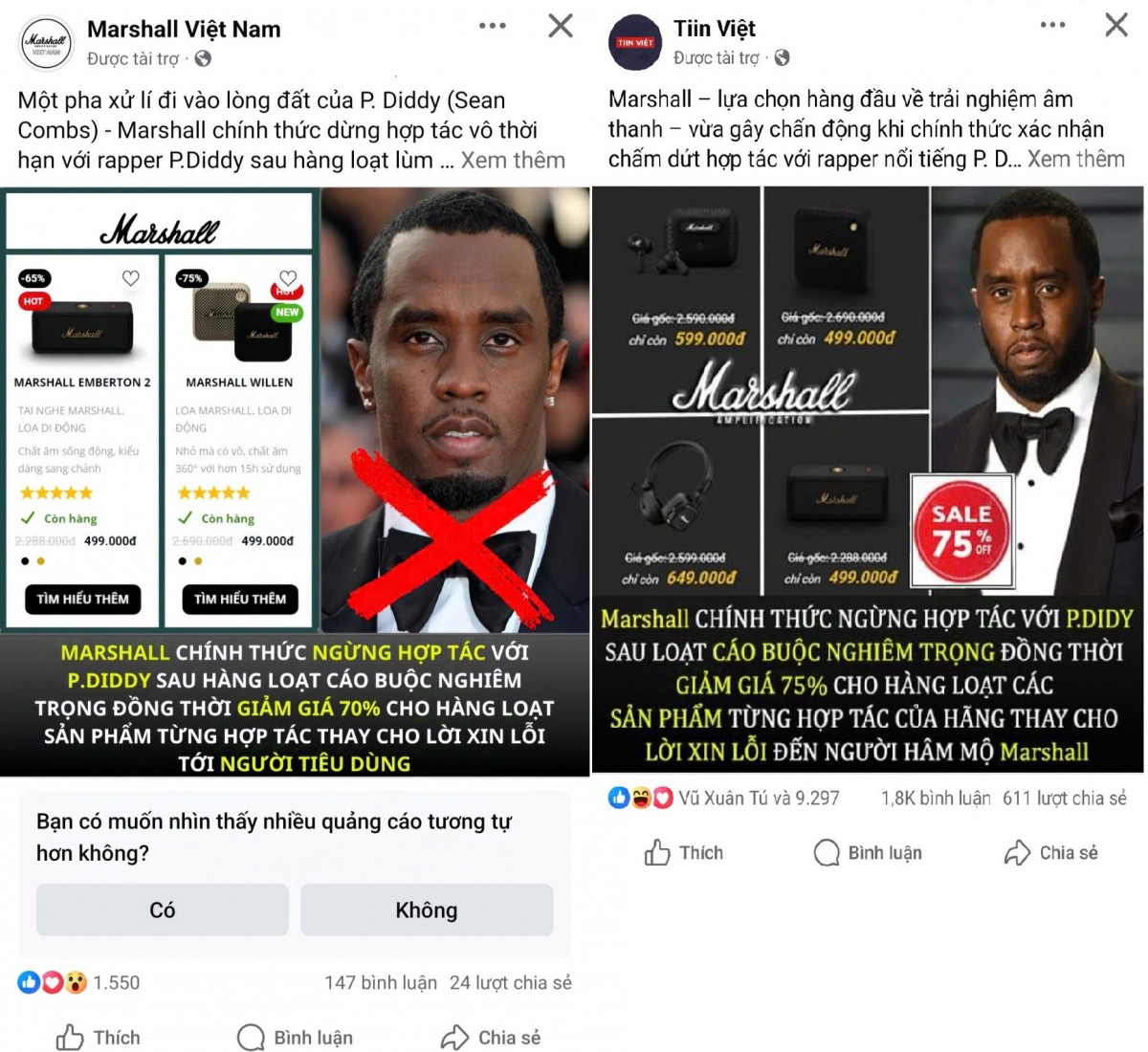 Theo ghi nhận của phóng viên, trên trang Facebook “Hóng Biến ShowBizz” đăng tải nội dung “Marshall chính thức dừng hợp tác với P.Diddy sau hàng loạt cáo buộc nghiêm trọng, đồng thời giảm giá 75% đối với dòng loa từng hợp tác thay cho lời xin lỗi đến khách hàng”, kèm theo đó là hình ảnh nam rapper P.Diddy và một số sản phẩm loa mang nhãn hiệu Marshall.
