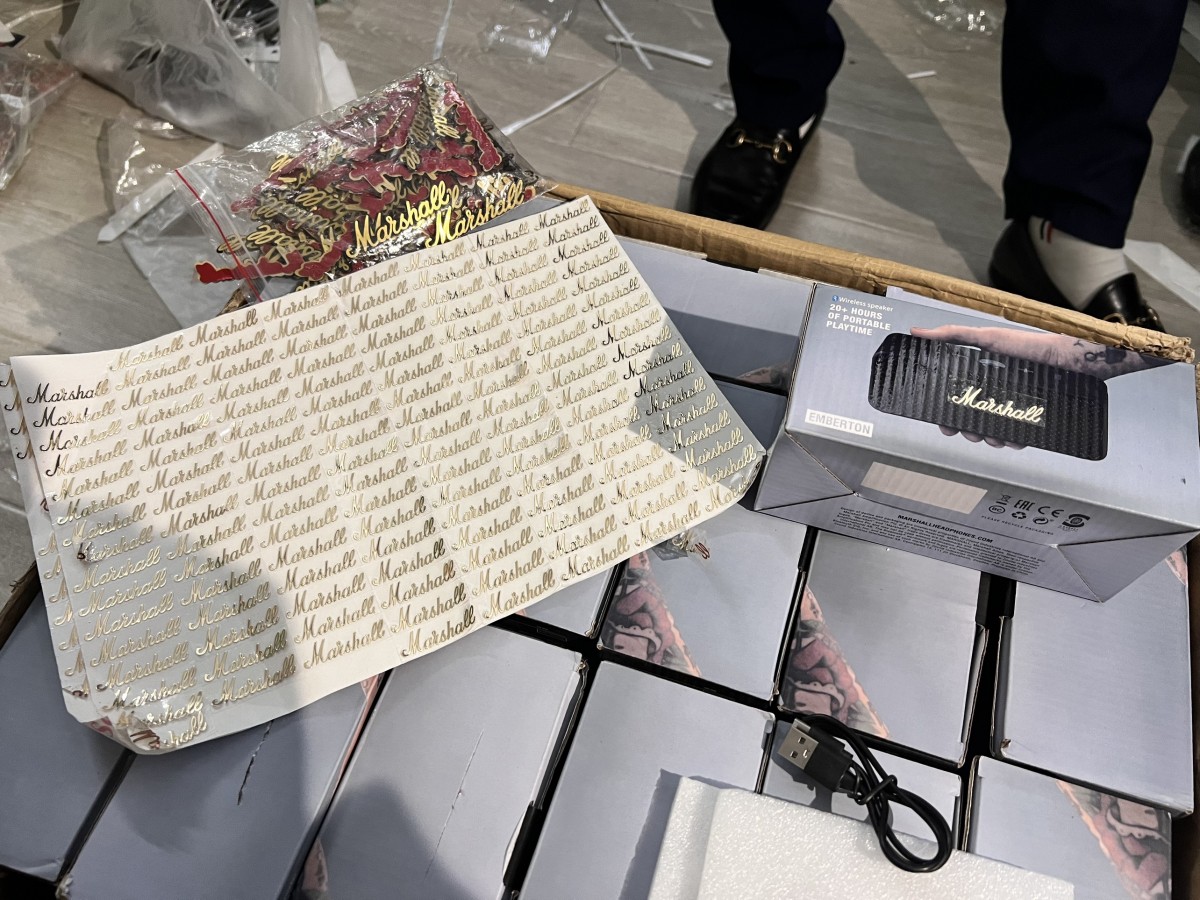 Ngoài tai nghe không dây và loa Bluetooth của thương hiệu nổi tiếng Marshall, lực lượng chức năng phát hiện một lượng lớn thẻ bảo hành chính hàng Marshall. Cùng với đó, là hàng loạt các mặt hàng khác như: Loa bluetooth Willen, Loa bluetooth Emberton, đồng hồ thông minh Smartwatch Series 8, Đồng hồ thông minh Hiwatch 8 Big 1.92, robot hút bụi Hitachi cùng lượng lớn tem, nhãn mác, vỏ hộp chứa đựng sản phẩm và thẻ bảo hành các hãng khác nhau.