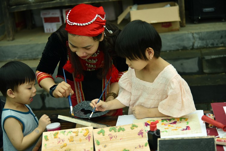 | Các cháu nhỏ rất thích thú tham gia in vẽ tranh dân gian tại chợ phiên vùng cao |