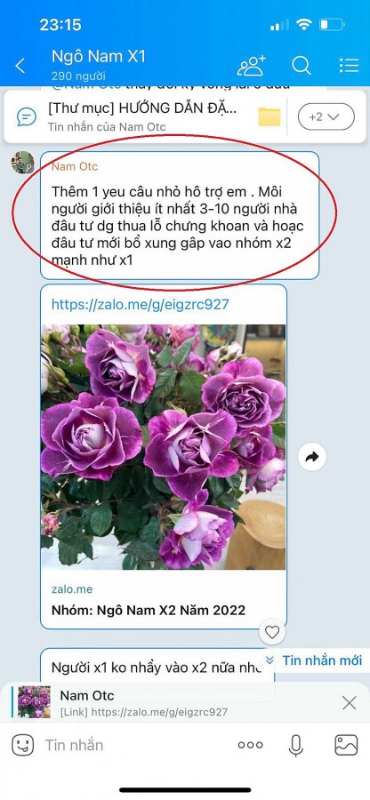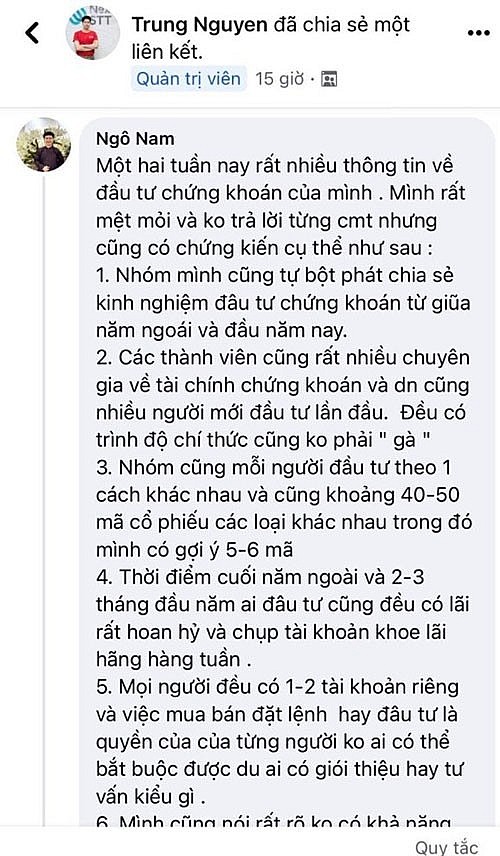 Tài khoản tên Ngô Nam cho rằng: Nhóm cũng mỗi người đầu tư theo một cách khác nhau và cũng khoảng 40-50 mã cổ phiếu các loại khác nhau trong đó mình có gợi ý 5-6 mã. Thời điểm cuối năm ngoài và 2-3 tháng đầu năm ai đầu tư cũng đều có lãi rất hoan hỷ và chụp tài khoản khoe lãi hàng tuần. Mọi người đều có 1-2 tài khoản riêng và việc mua bán đặt lệnh hay đầu tư là quyền của của từng người không ai có thể bắt buộc được dù ai có giới thiệu hay tư vấn kiểu gì. Mình cũng nói rất rõ không có khả năng lướt sóng mà đầu tư trung và dài hạn đến hết năm hay 1 – 2 - 3 năm.