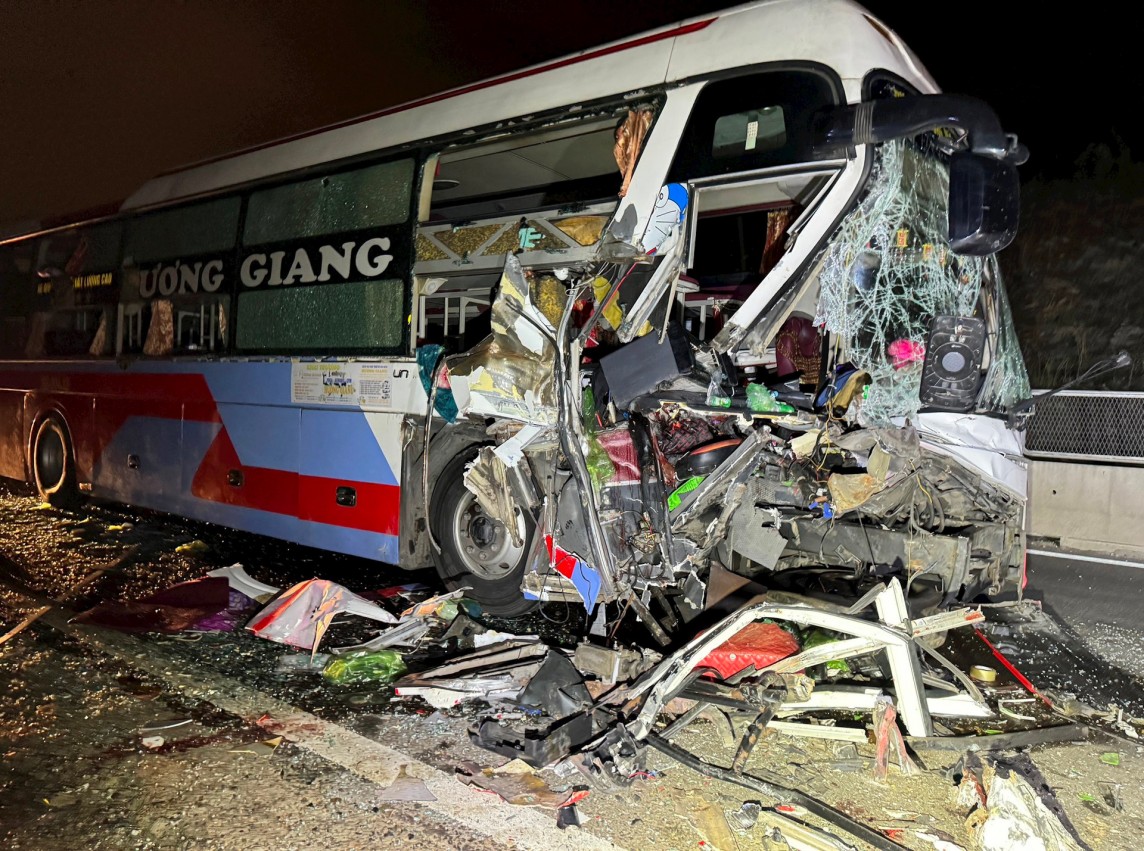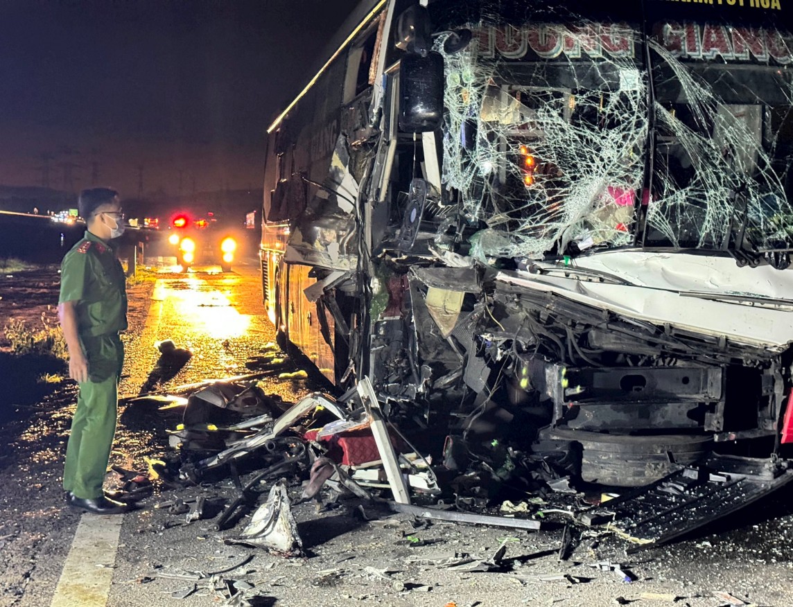 Cú tông làm phần đầu xe khách bể nát, bên cửa lên xuống bẹp dúm, kính xe vỡ vụn. Vụ tai nạn khiến anh Trần Xuân Lập (là phụ xe, sinh năm 1992, tỉnh Phú Yên) đang ngồi ở ghế phụ gần cửa lên xuống tử vong tại chỗ.