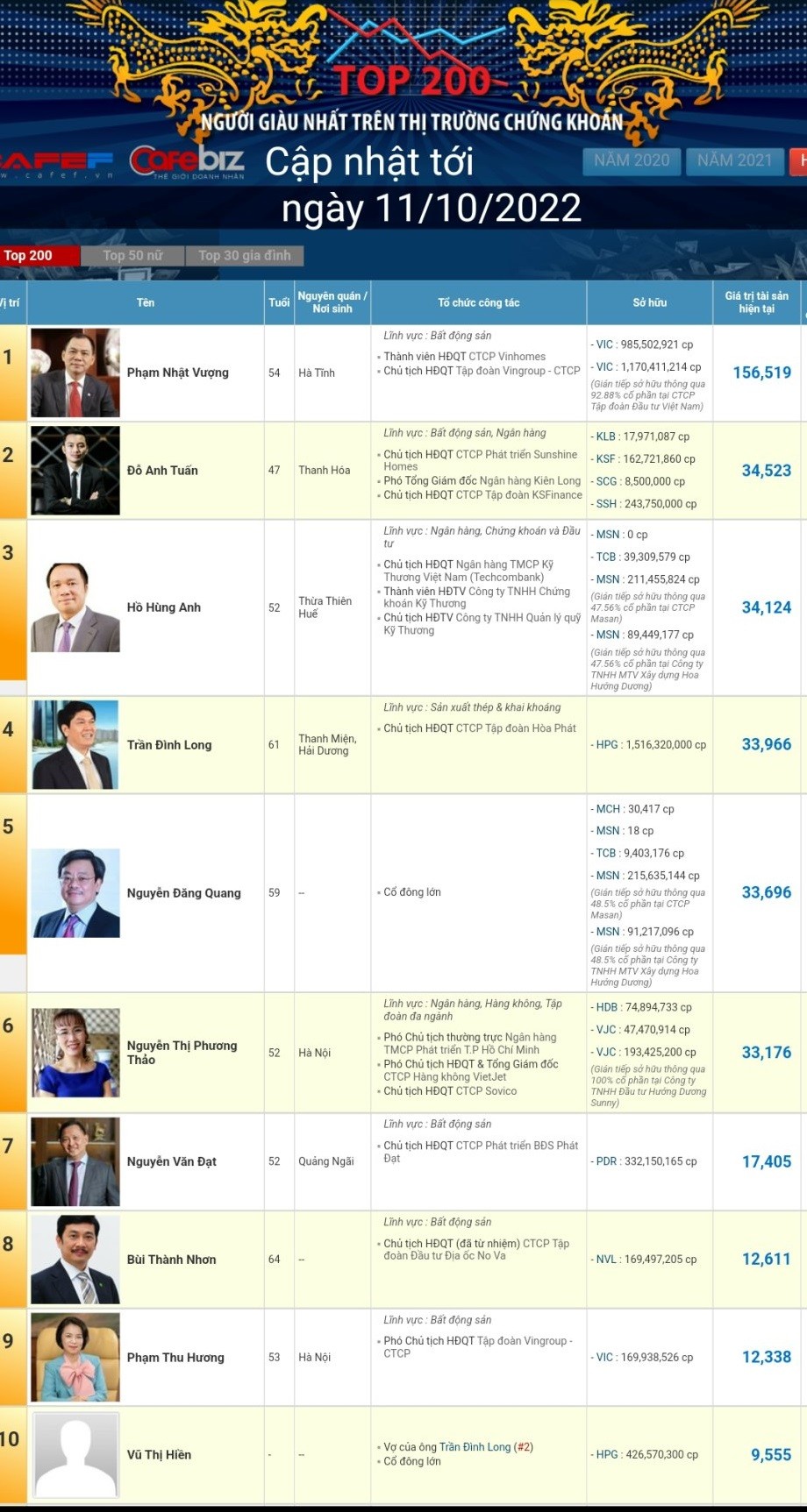 | Top 10 người giàu nhất sàn chứng khoán Việt Nam cập nhật tới 11/10/2022 |