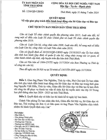 Ngày 31/7, ông Lại Văn Hoàn, Phó Chủ tịch UBND tỉnh Thái Bình ký ban hành Quyết định số 1236/QĐ-UBND của UBND tỉnh Thái Bình ngày 31/7/2024 về việc giao phụ trách điều hành hoạt động của Sở Giáo dục và Đào tạo Thái Bình cho ông Phạm Văn Nghiêm, Tỉnh ủy viên, Phó Chủ tịch UBND tỉnh Thái Bình trong thời gian ông Nguyễn Viết Hiển, Tỉnh ủy viên, Giám đốc Sở Giáo dục và Đào tạo Thái Bình bị tạm đình chỉ công tác để phục vụ thanh tra việc tổ chức kỳ thi tuyển sinh vào lớp 10 THPT năm học 2024-2025. Thời hạn tạm đình chỉ công tác là 15 ngày kẻ từ ngày 31/7/2024.