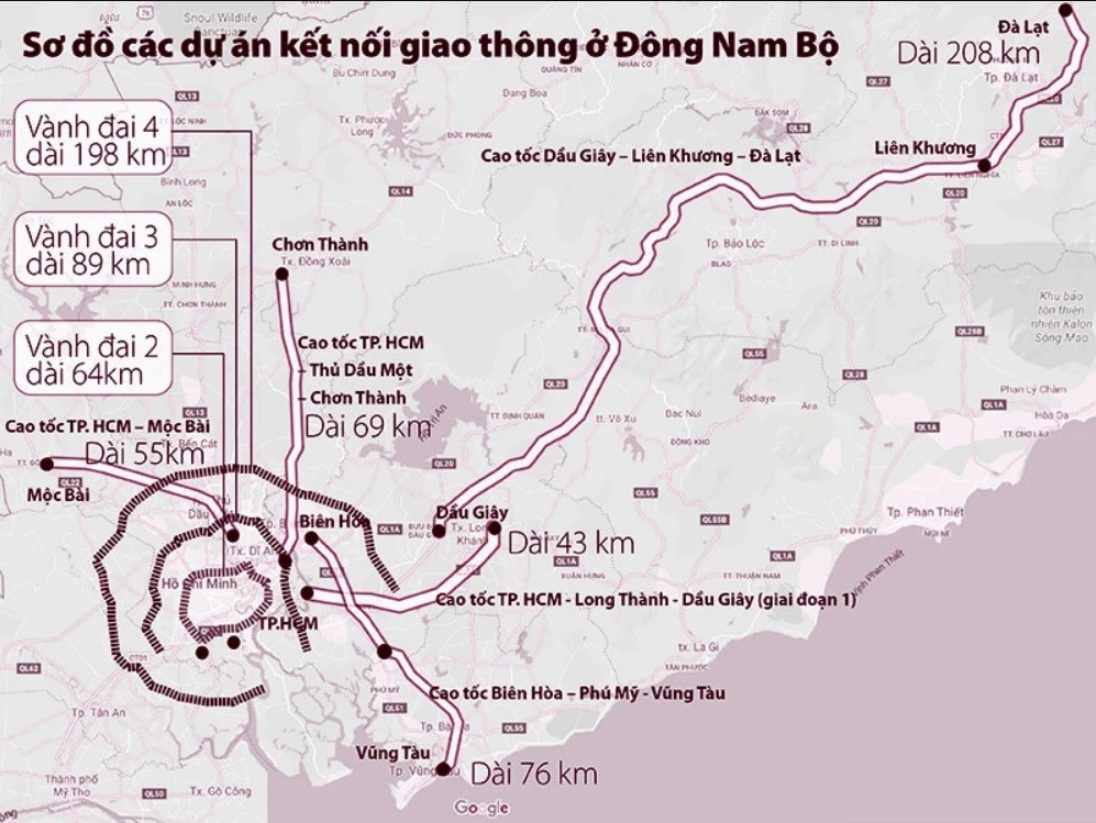 | Sơ đồ các dự án cao tốc và vành đai được quy hoạch ở khu vực Đông Nam bộ. Ảnh: Hồ Trang |