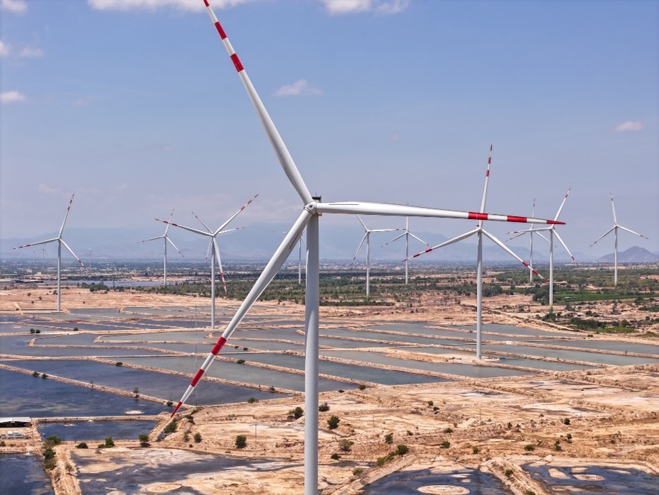 | Những cột phong điện vươn mình trên cánh đồng sản xuất muối – biểu tượng cho tầm nhìn đầu tư dài hạn của BIM Group tại Ninh Thuận. |