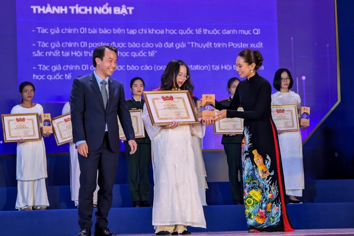 | Bà Vũ Phương Thanh, đại sứ thương hiệu Number 1 trao giải thưởng Nữ sinh KHCN Việt Nam. |