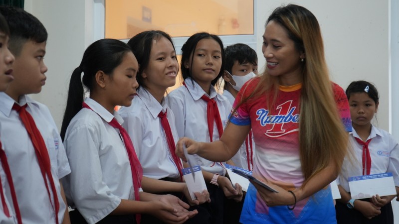 | Chị Vũ Phương Thanh, đại sứ thương hiệu Nước tăng lực Number 1 trao học bổng và động viên các em học sinh vượt khó. |