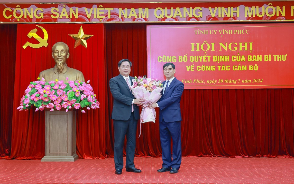 | Lãnh đạo Tỉnh uỷ Vĩnh Phúc chúc mừng tân Phó Bí thư Tỉnh uỷ Trần Duy Đông (Ảnh: MPI) |