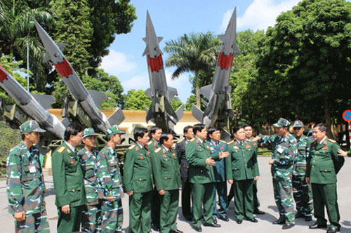 | Lãnh đạo Bộ quốc phòng thăm quan khu trưng bày thiết bị quân sự. (Ảnh: HM) |