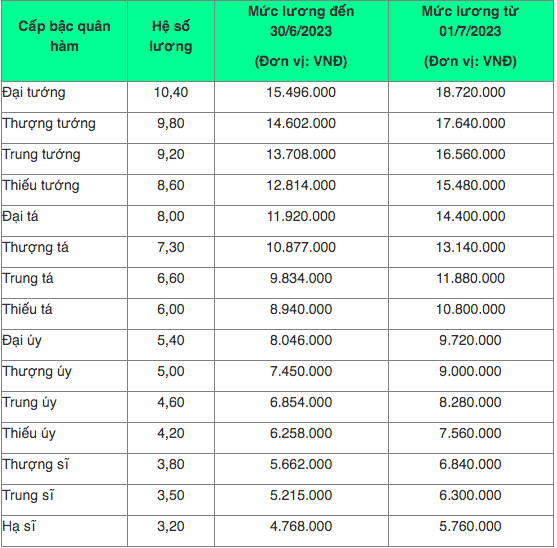 Chi tiết bảng lương công an quân đội trong năm 2023 như sau: