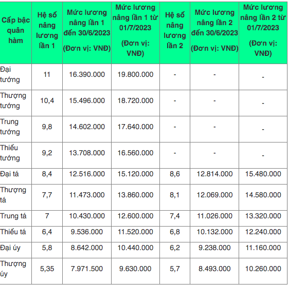 | Mức lương sĩ quan quân đội theo từng lần nâng lương năm 2023 sẽ có 2 mức cụ thể như trên |
