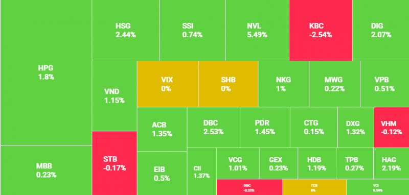 Với nhóm sản xuất, sắc đỏ nhỉnh hơn sắc xanh. Trong đó, MSN giảm 0,15%, GVR giảm 1,17%, SAB giảm 0,81%, DGC giảm 0,33%... Ở phe tăng điểm, nổi bật hơn cả là cổ phiếu thép khi HPG tăng 1,8%, HSG tăng 2,44%, NKG tăng 1%.