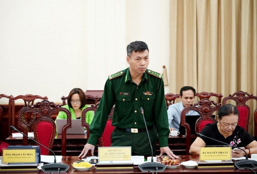 | Thượng tá Lê Thiện Thành, Phó trưởng Phòng Hướng dẫn Điều tra, Cục Phòng, chống Ma túy và Tội phạm, Bộ Tư lệnh Bộ đội Biên phòng phát biểu tại tạo đàm. |