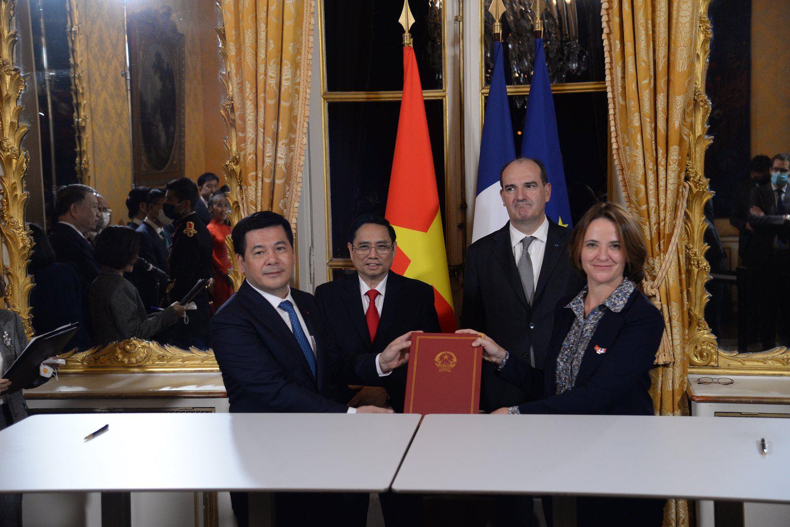 Ngay sau đó, hai Thủ tướng đã chứng kiến Lễ ký kết một số văn bản, thỏa thuận hợp tác, hợp đồng kinh tế lớn, đáng chú ý có: Thỏa thuận hợp tác giữa bộ Tư pháp Việt Nam và Tham Chính viện Pháp giai đoạn 2021-2026; Biên bản ghi nhớ hợp tác trong lĩnh vực vệ tinh, thành phố thông minh, nhận dạng kỹ thuật số và an ninh mạng giữa Tập đoàn bưu chính viễn thông Việt Nam và Tập đoàn Thales và các Biên bản ghi nhớ hợp tác của Vietjet Air, Bamboo Airway và Safran.