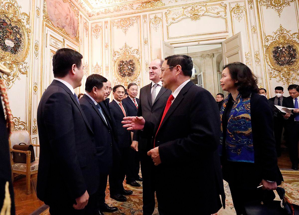 Thủ tướng Jean Castex bày tỏ vui mừng đón Thủ tướng Phạm Minh Chính sang thăm chính thức Cộng hòa Pháp, đánh giá cao quan hệ gắn bó giữa nhân dân hai nước và mức độ phát triển sâu rộng, đa dạng của quan hệ Đối tác chiến lược với Việt Nam trong thời gian qua. Thủ tướng Phạm Minh Chính cảm ơn sự đón tiếp trọng thị mà Chính phủ Pháp và cá nhân Ngài Thủ tướng đã dành cho Đoàn cấp cao Việt Nam; đánh giá cao vai trò và vị thế của Pháp trong Liên minh châu Âu cũng như trên trường quốc tế; nhấn mạnh tầm quan trọng của quan hệ với Pháp trong tổng thể chính sách đối ngoại của Việt Nam, mong muốn quan hệ Đối tác chiến lược Việt Nam - Pháp tiếp tục phát triển mạnh mẽ hơn nữa.