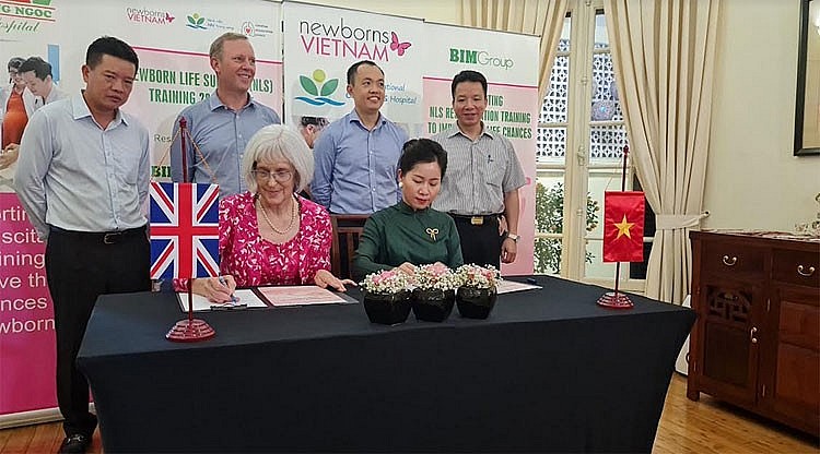 Lễ ký kết hợp tác tài trợ giữa Tập đoàn BIM Group và Tổ chức Newborns Vietnam có sự chứng kiến của Đại sứ Anh quốc tại Việt Nam, lãnh đạo và chuyên gia Y tế Anh Quốc và Việt Nam.