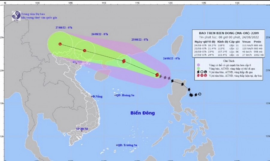 Theo bản tin của Trung tâm Dự báo Khí tượng thủy văn Quốc gia, hồi 13 giờ ngày 23/8, vị trí tâm bão ở trên khu vực phía Đông Bắc đảo Lu-dông (Phi-líp-pin). Sức gió mạnh nhất vùng gần tâm bão mạnh cấp 10 (89-102km/giờ), giật cấp 12. Dự báo đến 13 giờ ngày 24/8, vị trí tâm bão ở khoảng 19,6 độ Vĩ Bắc; 118,3 độ Kinh Đông, trên vùng biển phía Đông Bắc khu vực Bắc Biển Đông, cách quần đảo Hoàng Sa khoảng 800km về phía Đông Bắc. Sức gió mạnh nhất vùng gần tâm bão mạnh cấp 10-11 (89-117km/giờ), giật cấp 13.