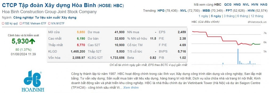 Ghi nhận của phóng viên, kết thúc phiên giao dịch sáng nay (ngày 1/8/2024), sau 3 phiên giảm sàn liên tục (từ 29 đến 31/7), mã cổ phiếu HBC đã tăng trở lại, đang ở mốc 5.930 đồng/ cổ phiếu. Lượng giao dịch đạt gần 1,5 triệu cổ phiếu.