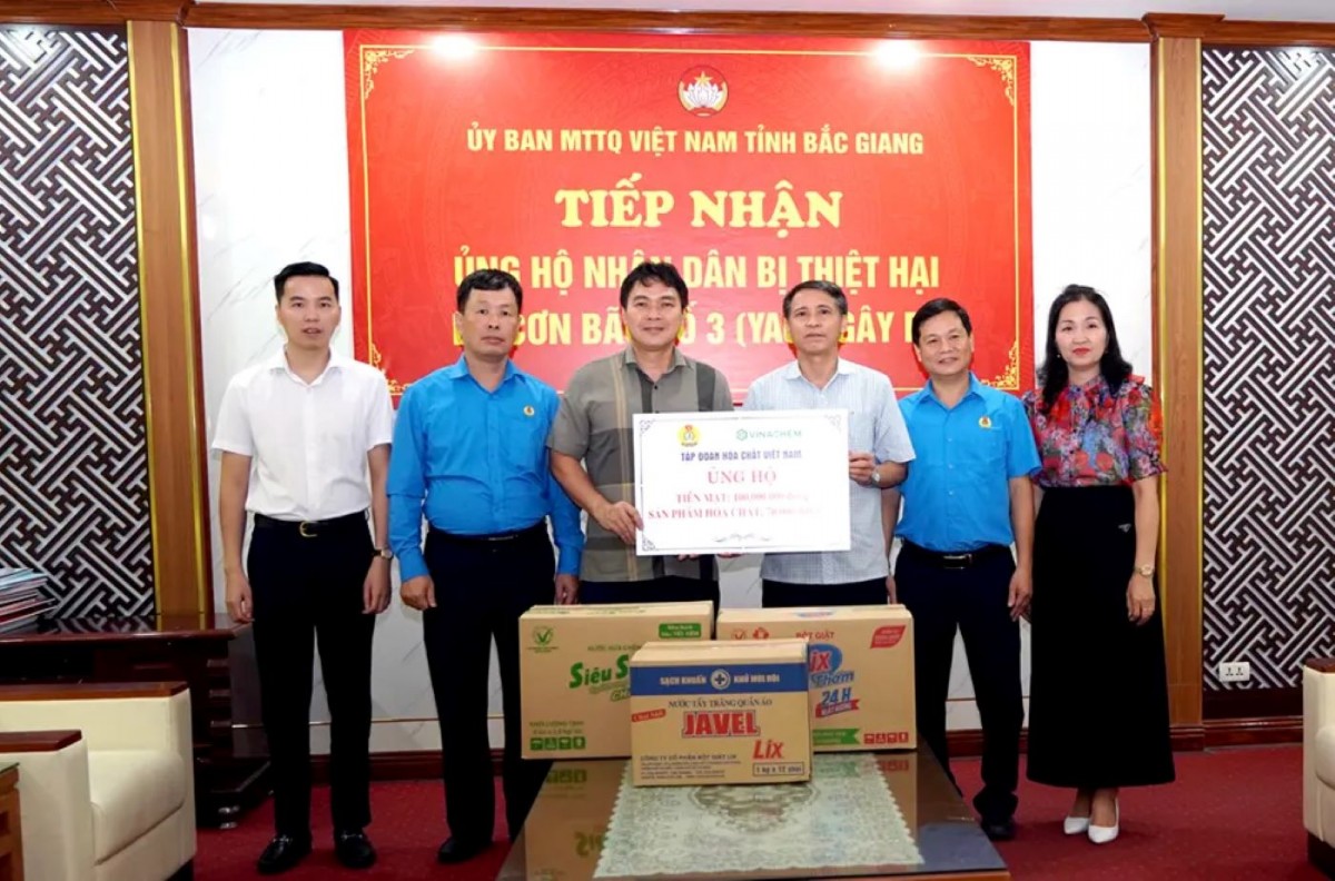 Sau các hoạt động hỗ trợ đồng bào tỉnh Phú Thọ, Lào Cai khắc phục hậu quả bão lũ. Sáng ngày 17/9, đồng chí Nguyễn Tuấn Minh, Thành viên HĐTV Tập đoàn; Đồng chí Nguyễn Huy Thông, Chủ tịch Công đoàn Công nghiệp Hóa chất Việt Nam đã đến Ủy ban Mặt trận Tổ Quốc Việt Nam tỉnh Bắc Giang trao tiền và các sản phẩm thiết yếu do đơn vị thành viên Tập đoàn sản xuất giúp đỡ người dân tỉnh Bắc Giang.
