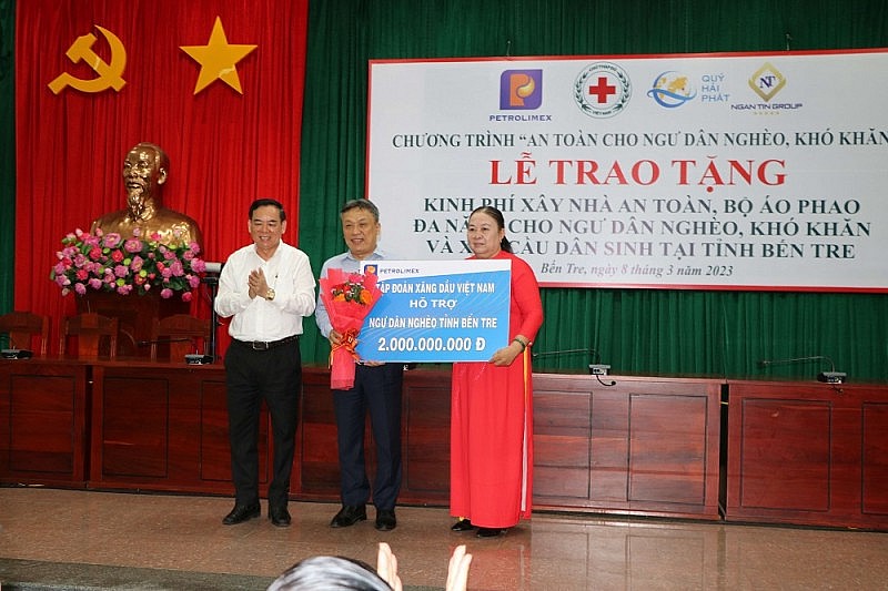 Cụ thể, Tập đoàn Xăng dầu Việt Nam - Petrolimex đã trao tặng kinh phí 3 tỷ đồng để thực hiện 2 chương trình an sinh xã hội gồm: Chương trình “An toàn cho ngư dân nghèo, khó khăn” nhằm ủng hộ kinh phí xây nhà an toàn cho 40 hộ ngư dân nghèo có hoàn cảnh khó khăn (trị giá 50 triệu đồng/hộ) và ủng hộ kinh phí xây cầu dân sinh khu vực nông thôn, khu vực ven biển tại tỉnh Bến Tre nhằm chia sẽ phần khó khăn, giúp các hộ ngư dân ổn định cuộc sống.
