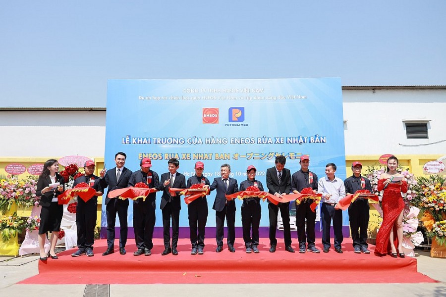 | Lãnh đạo Petrolimex và ENEOS cắt băng khai trương dịch vụ tại cửa hàng |