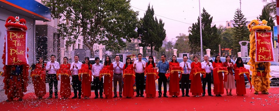 | Lãnh đạo tỉnh Hà Giang cùng lãnh đạo Petrolimex, đại diện Vinfast cắt băng khánh thành trạm sạc |