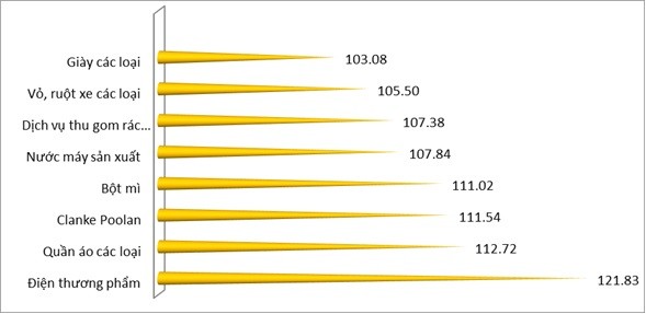 Một số các sản phẩm công nghiệp tăng so với tháng trước như: Bột mì (+1,59%), giày các loại (+10,54%), quần áo các loại (+12,5%), vỏ ruột xe các loại (+14,22%), gạch các loại, điện thương phẩm và dịch vụ thu gom rác thải độc hại không thể tái chế cũng tăng nhẹ.