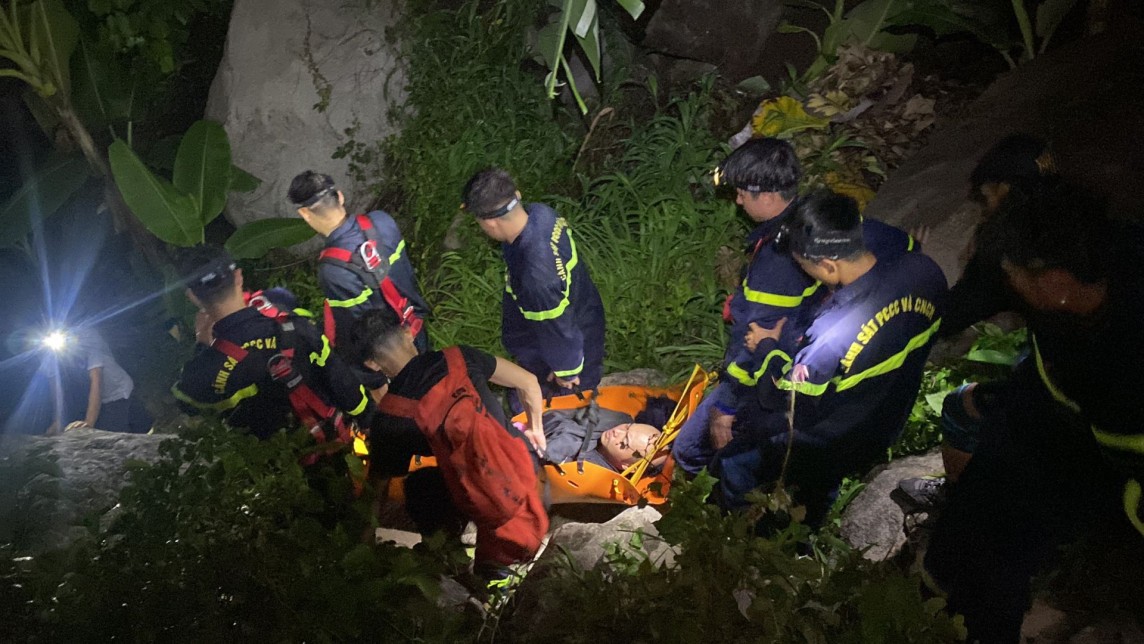 Tiếp đến, lực lượng đã dùng cáng cứu thương di chuyển nạn nhân bị thương, hỗ trợ các nạn nhân còn lại di chuyển xuống chân núi.