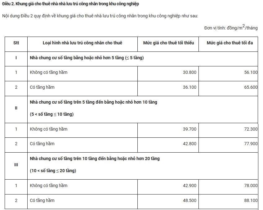 Theo đó, các loại hình nhà lưu trú công nhân cho thuê có mức giá cụ thể như sau:
