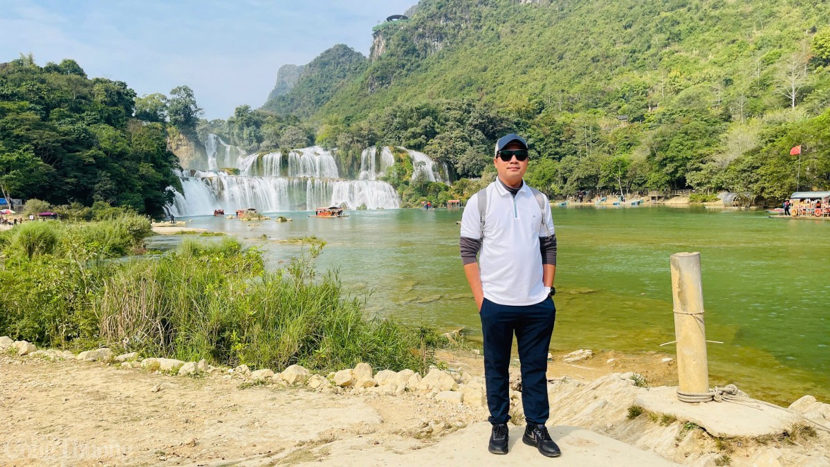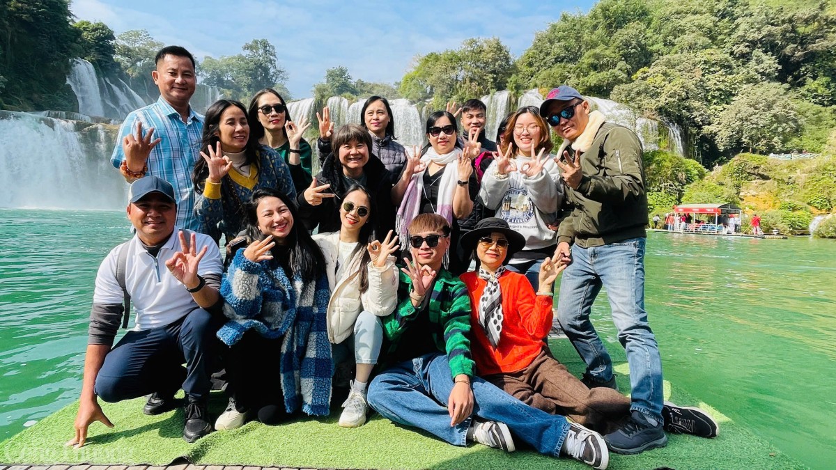 | Du khác thích thú và mãn nhãn trước vẻ đẹp như tranh vẽ của thác Bản Giốc |
