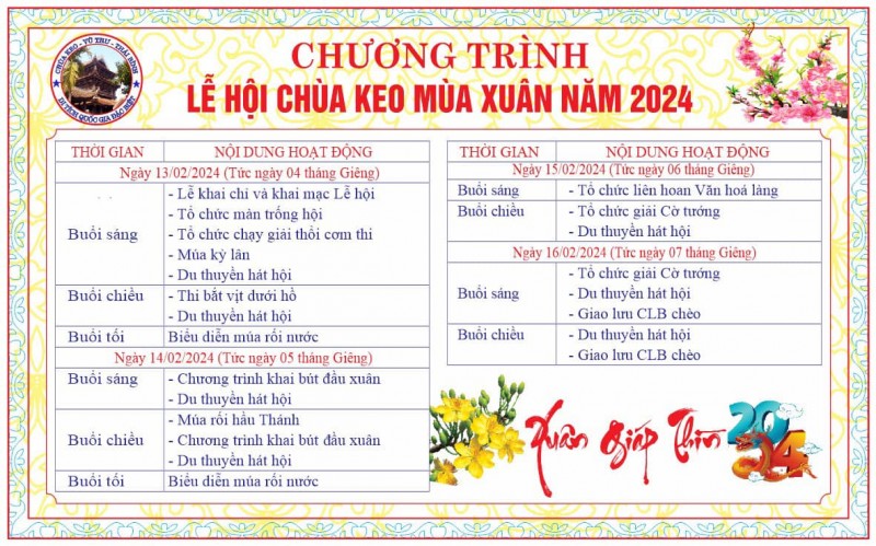 Theo đó, Lễ hội chùa Keo mùa xuân năm 2024 được tổ chức trong 4 ngày, từ 13/2 đến 16/2 (mùng 4 đến mùng 7 Âm lịch) với nhiều hoạt động văn hoá tâm linh cả phần lễ và phần hội.